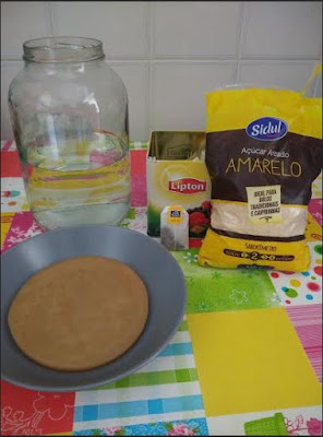 Vai precisar de uma colónia saudável-uma panqueca (de preferência com algum liquido da preparação anterior). Uma chávena de açúcar. Algumas saquetas de chá preto e um recipiente grande de vidro.